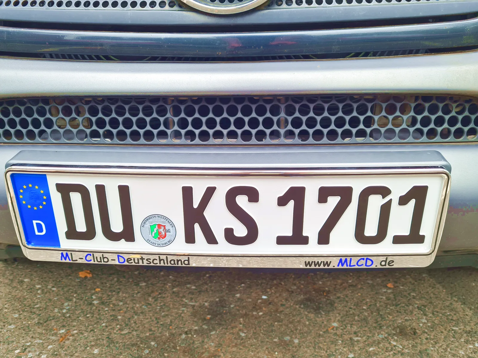 Nachher hinten: Neuer MLCD-Chromlook-Kennzeichenhalter; neues Kfz-Kennzeichen mit neuen Stempeln