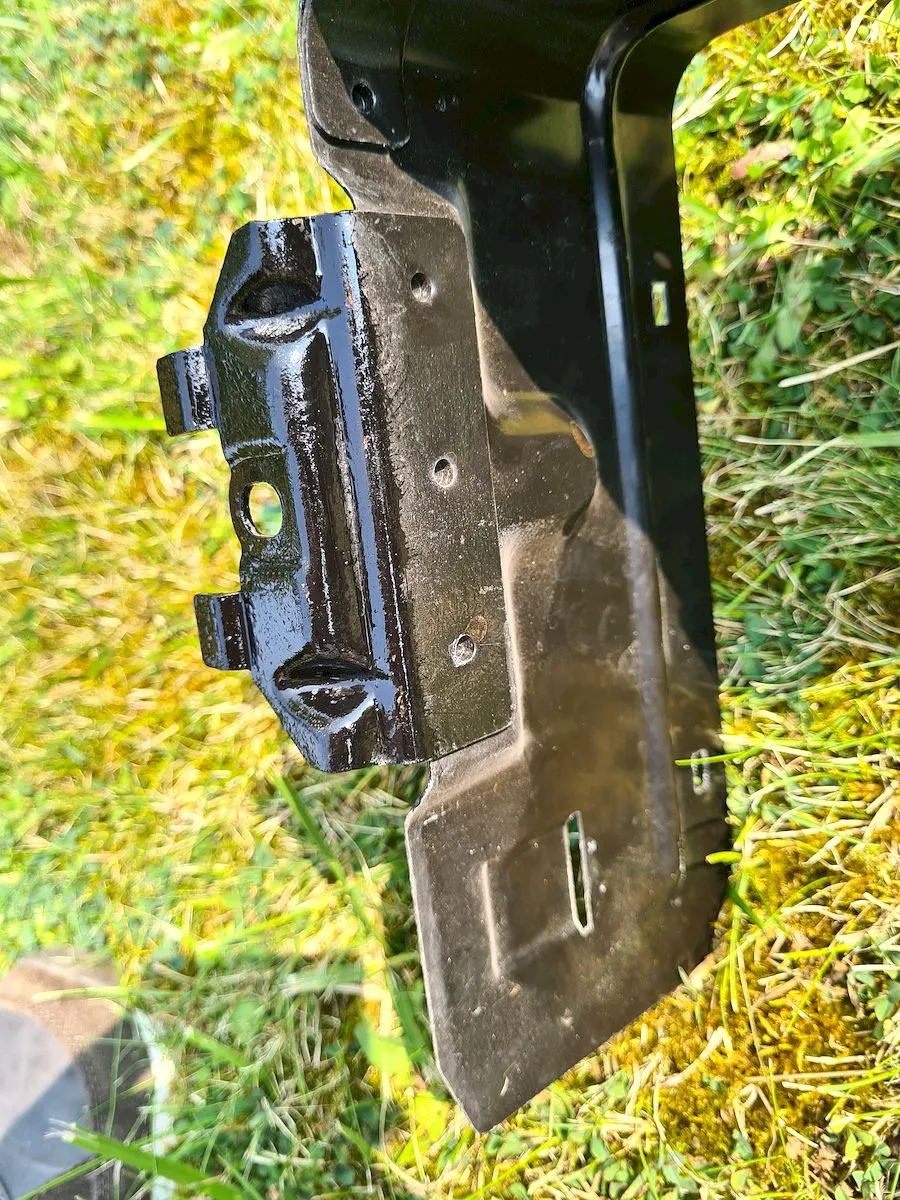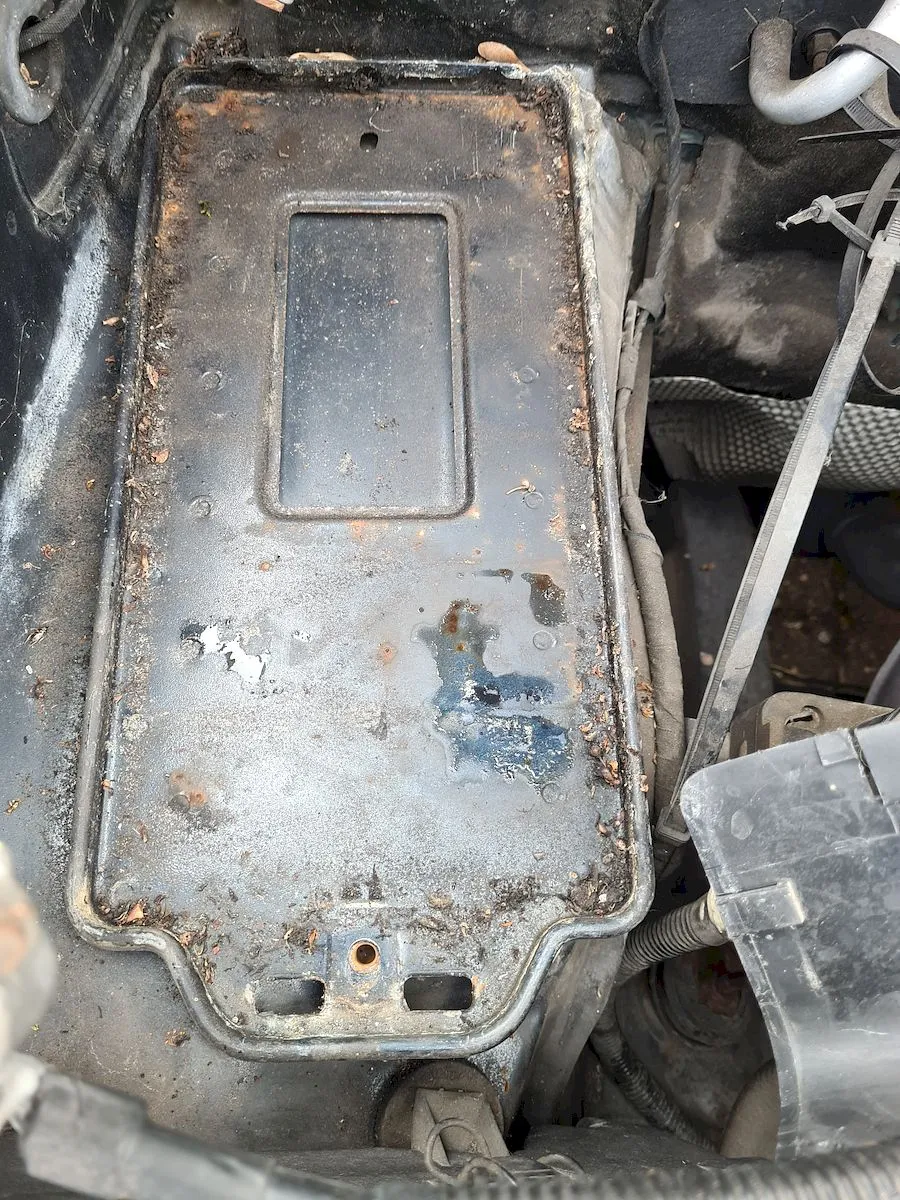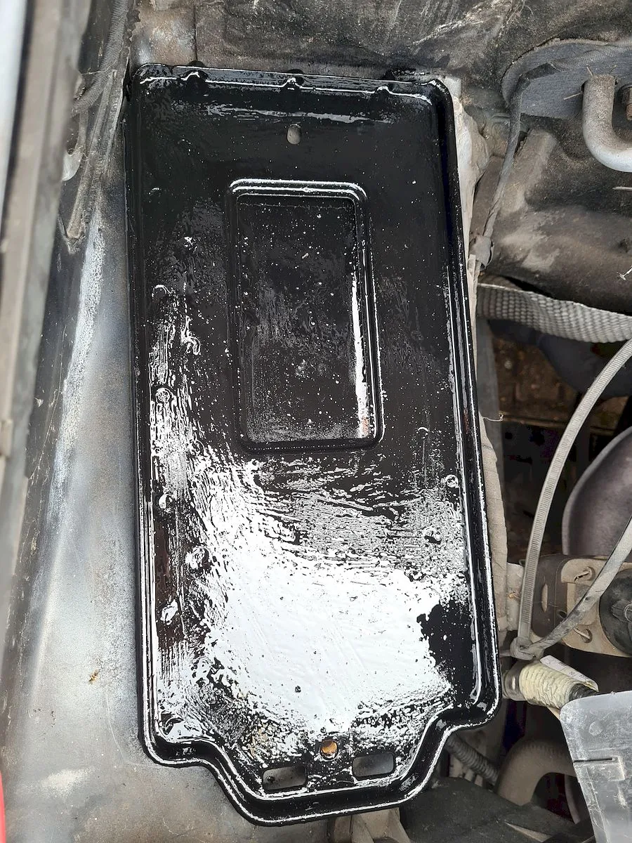 Dieses gereinigt und von beginnendem Rostansatz befreit und mit der bewährten schwarzen Rostschutzfarbe gestrichen, genau wie dann die Akku-Trägerplatte, nachdem da und drumrum erst mal ordentlich gesaugt und gebürstet war. So kommt man halt mal gerade an Stellen ran, wo man sonst keine Chance hat. Und im Bereich der Wasserabläufe im und am Wasserkasten direkt darüber, da war "ein gutes Pfund" Erde, biologisch abgebauter Sperrschaumstoff und Blätter und Lindensamen wegzusaugen.