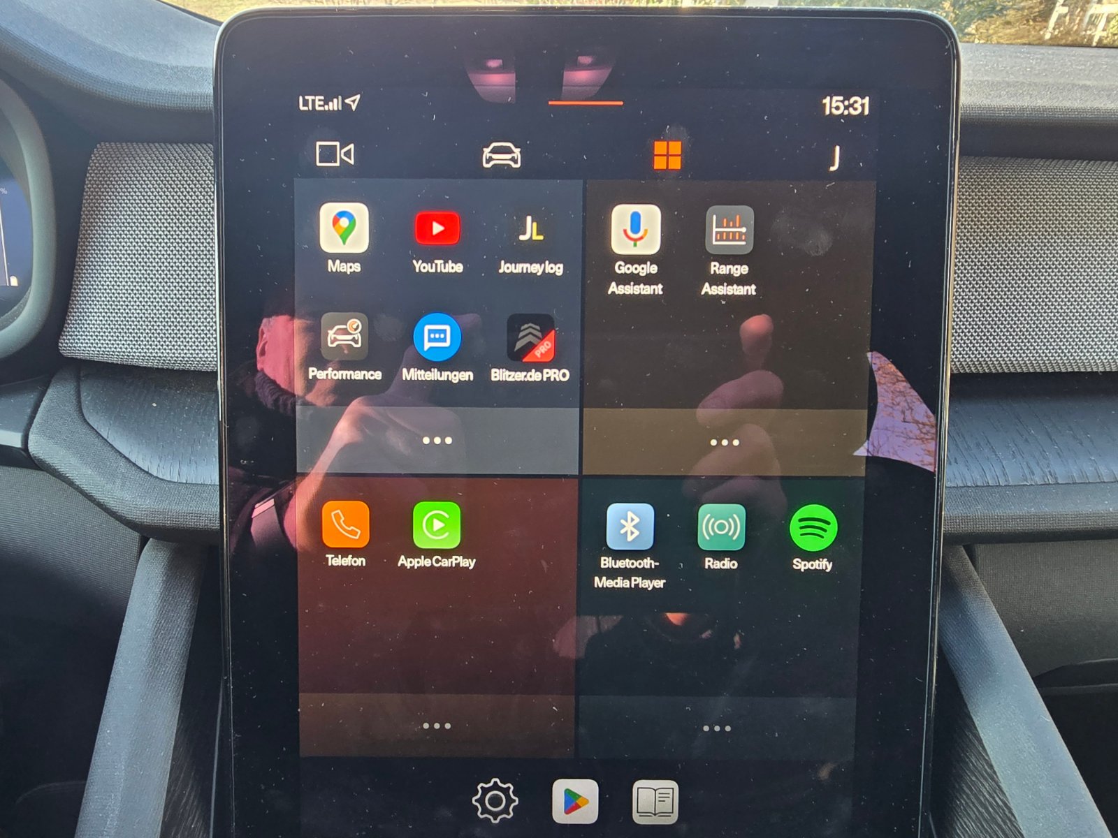 Auf dem großen Display in der Mitte kann man auch etliche weitere Apps bedienen. Interessant fand ich, dass dort eine Radarwarner-App installiert und automatisch aktiviert war, die auch die Radarfallen in Belgien kennt und in Aachen sogar genau angab, um welchen Typ es sich handelt. Stationär, auf Anhänger montiert oder mobil. Die Ansagen kamen jeweils 500m und zur Erinnerung noch einmal 150m vor der Kontrollstelle, stimmten auch, außer bei den mobilen, denn die schienen schon wieder verschwunden zu sein, was aber auch verständlich ist. Die Stellen, wo die mobilen Blitzen gemeldet wurden, sind mir jedenfalls dafür bekannt, dass diese dort häufiger messen.