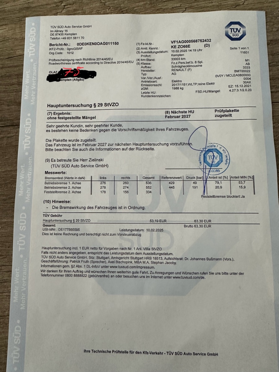 Heute war es nun soweit, der online vereinbarte Termin zur Hauptuntersuchung nach §29 der Straßenverkehrs-Zulassungs-Verordnung stand an. Zum Technischen Überwachungsverein nach Kempten, beim Empfang der überaus freundlichen jungen Dame den Obulus von 63,30€ übergeben und schon ging es los. Mit dem Zoe befuhr der Prüfer zuerst die Prüfhalle und mal direkt auf den Bremsen-Prüfstand. Hier wollte dieser dann den Stecker ind die vorgesehene Buchse der Onboard-Diagnose stecken, fand diese aber nicht auf Anhieb. Sein Kollege meinte: die ist in der Mittel-Konsole. Falsch, meinte ich dann. Die befindet sich ohne Abdeckung direkt vor dem Hauben-Öffnungshebel links im Fahrer-Fußraum. Nachdem dies dann geklärt war, quälte der Prüfer das Auto dann auf dem Prüfstand. Mit Erfolg, gleichmäßige Bremsleistung so wie es sein sollte. Weiter ging es mit der technischen Durchsicht, Lichter, Hupe und so weiter. Bisher konnte der Sachverständige keine Mängel entdecken. Nun lächelte dieser und meinte: jetzt schauen wir uns mal das Problem einer jeden Zoe an. Die Vorderradachse, ein sehr häufiges Problem auch bei neuen Autos. Ausgeschlagene Traggelenke sind hier fast immer zu bemängeln. Bei unserer auch schon? Nein, alles ok. Keine Mängel: