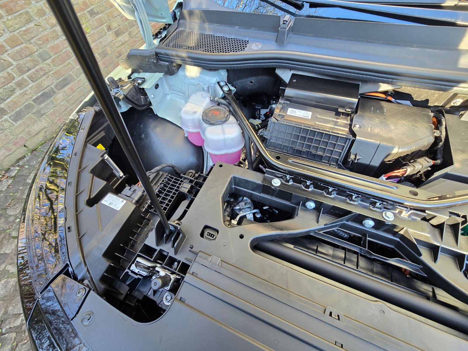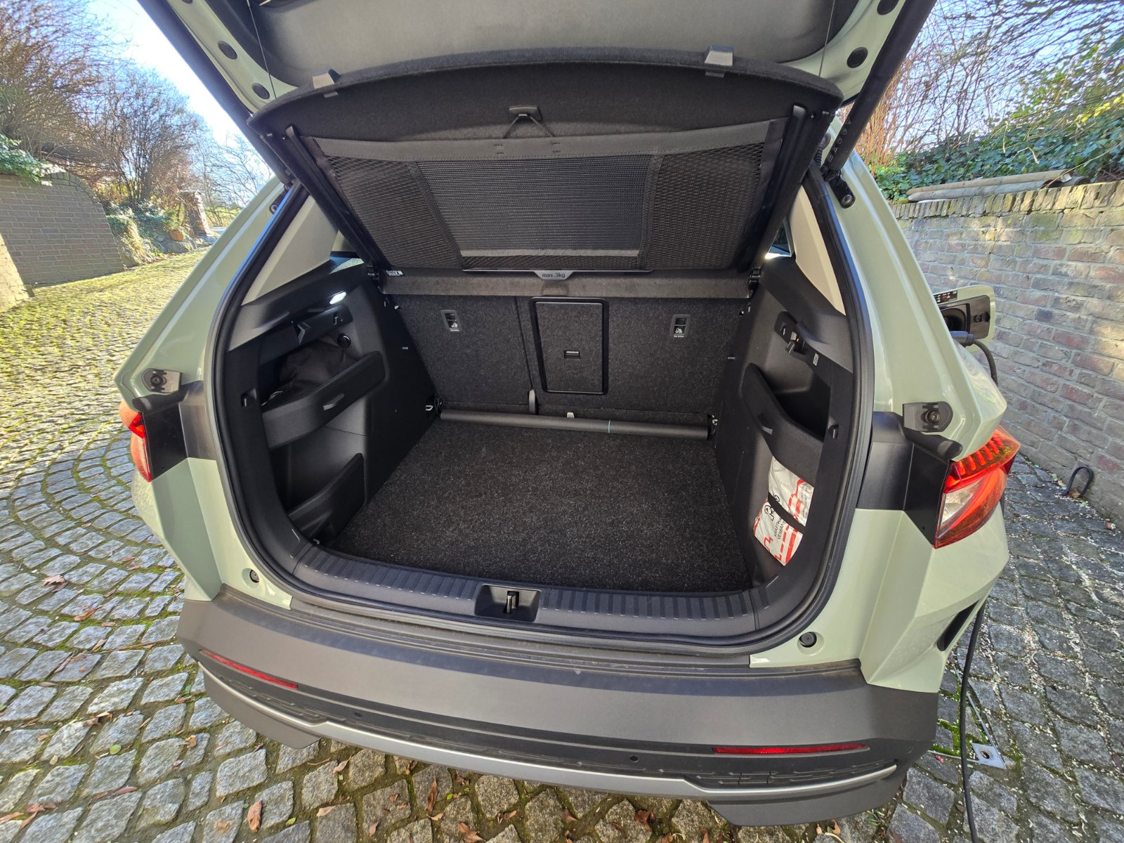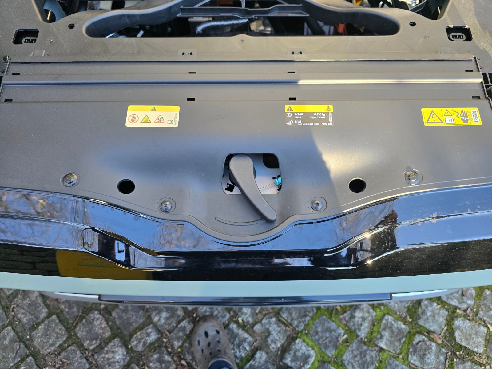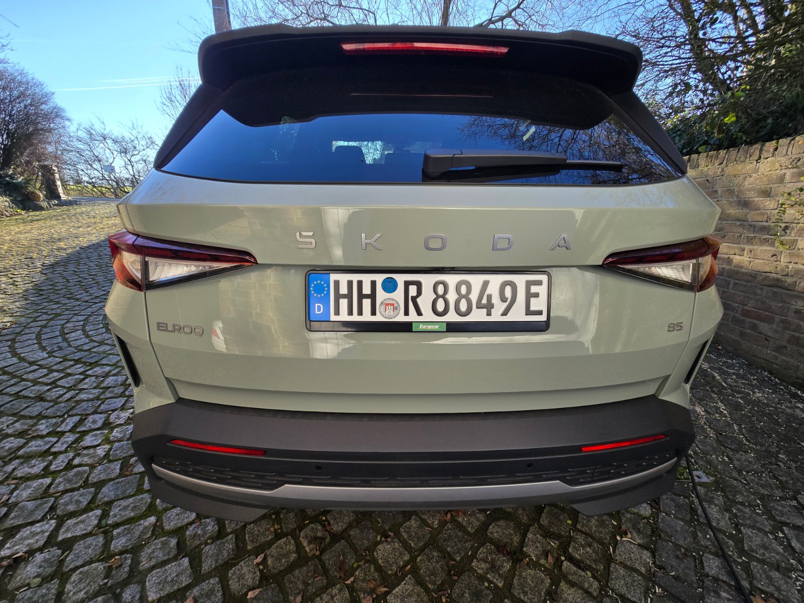 wünscht Bilder? Dann bekommt er Bilder. Vom Skoda Elroq 85, von allen Seiten, auch innen und außen. Was mich wieder ein wenig wahnsinnig gemacht hat, ist die Öffnung der Motorhaube. Die Entriegelung im Fahrerfußraum ist leicht zu finden, aber die Freigabe der Fanghaken, wenn die Haube schon entriegelt ist, lässt sich nur herausfinden, wenn man mit der Taschenlampe leuchtet: Da muss man über einen Hebel, den man seitlich schieben muss, einen Seilzug betätigen, der die Haken freigibt. Haubenlift hat er auch nicht, man muss also manuell anheben und wie vor Jahrzehnten, eine Stange zum Aufstellen einhaken.