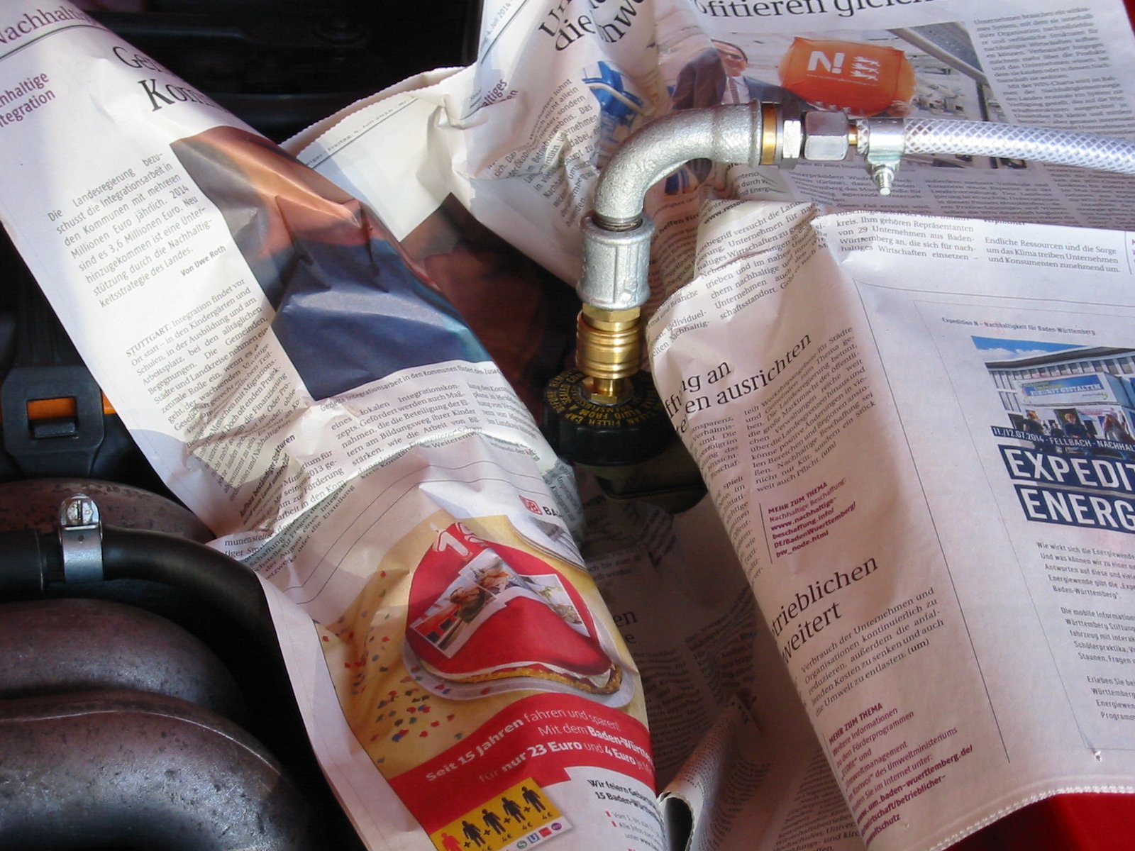 zum Thema Bremsflüssigkeit wechseln bzw. Bremssystem entlüften: Ich hab mir da was ganz einfaches, aber sehr arbeitserleichterndes gebaut, siehe die zwei beigefügten Bilder. U. a. braucht man dafür einen Deckel, den man in ebay oder beim Verwerter günstig bekommen kann. Den Rest bekommt man im technischen Handel. Nach Auffüllen des Behälters Deckel drauf, bis zu 1,5 bar Überdruck aus Reserverad oder Kompressor, dann am Entlüfternippel ablassen. Mehrmals wiederholen, fertig.