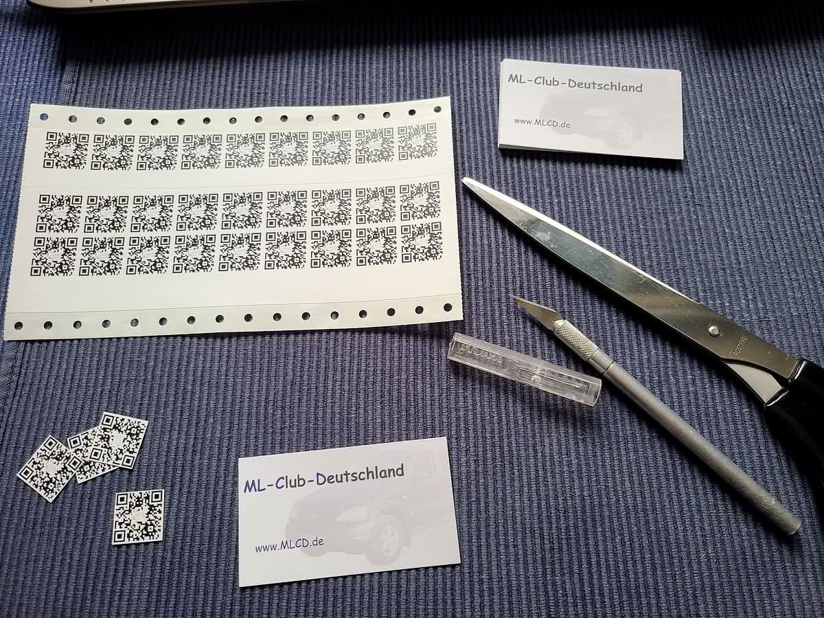 So drucke ich nun per Laser die QR-Codes, mit ML in der Mitte, auf selbstklebendem Trägerpapier aus und schneide und klebe diese auf die Kärtchen. Immer schön gerade, denn es sind ja schließlich Visitenkarten.