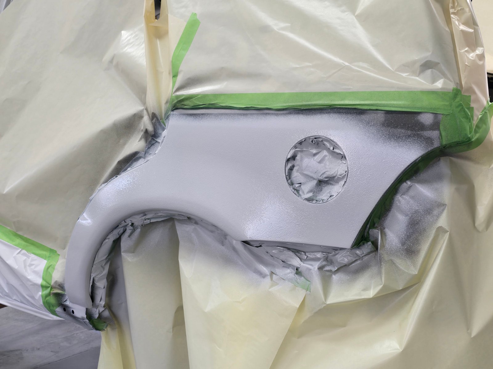 Tatsächlich war ich heute bei unserem ML. Gerade eben, als ich ankam, war Dieter Kurabi damit beschäftigt, die hinteren Kotflügel, die ja teilweise ersetzt, dann die Nähte verzinnt und gespachtelt und mit Epoxy grundiert wurden, mit Spritzspachtel versehen wurden. Der kann relativ dick aufgetragen werden und bildet eine sehr schöne Basis, für die nachfolgende Lackierung, denn dieser füllt die letzten kleinsten Unebenheiten und Kratzer.