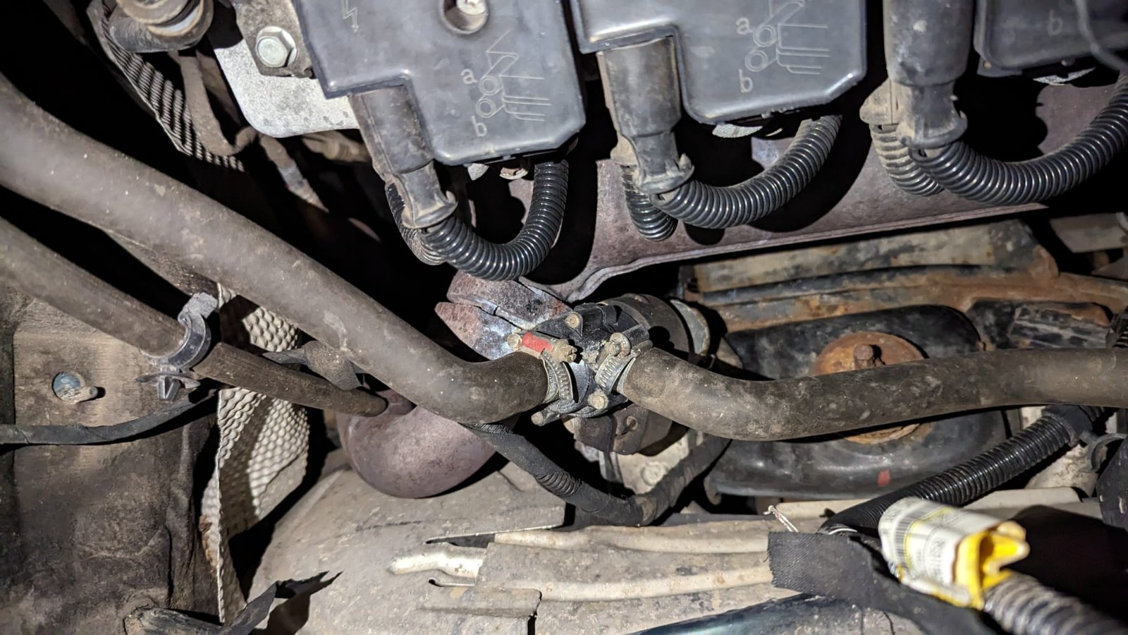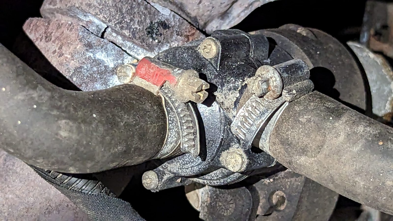 Leichter Kühlflüssigkeitsverlust - so zumindest roch es nach der Autobahnfahrt gerade, Zuhause angekommen habe ich den Übeltäter entdeckt. An der Schelle dort leckt es Kühlmittel, welches am warmen Motorblock dann zischend verbrennt und einen unangenehmen Geruch absondert.