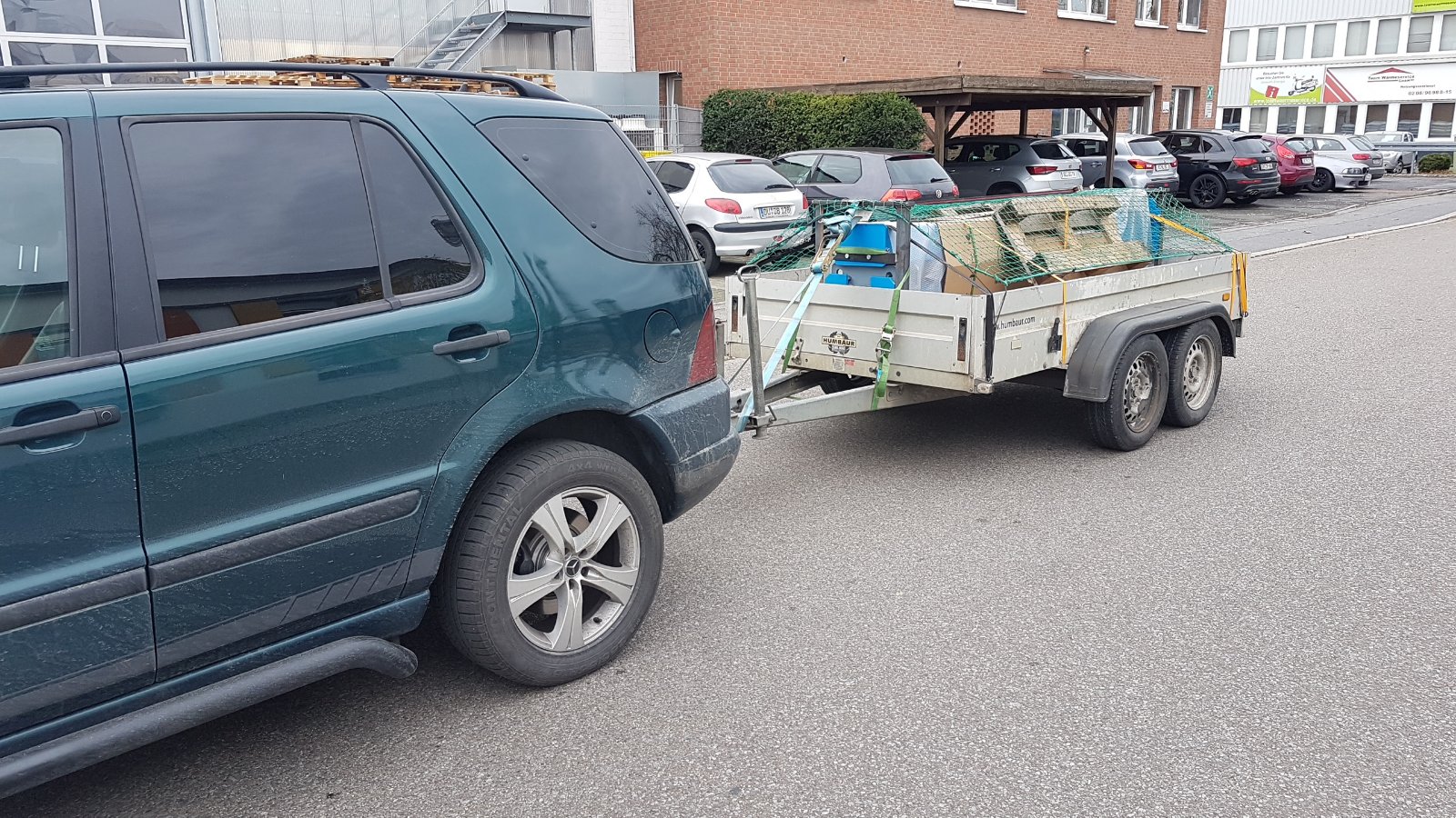 Da mußte ich eine Ladung 140mm Wärmedämmung für meinen Sohn holen, 4 Pakete ins Auto und 14 Pakete auf den Hänger. Da hätten auch noch 2 mehr gepasst aber dann wäre das Netz knapp gewesen. Stefan009