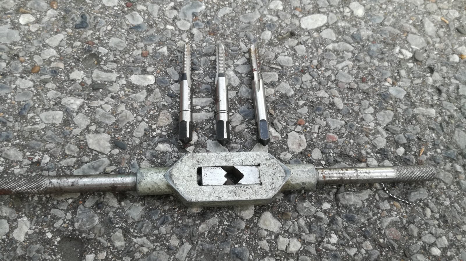 So habe ich die Schraube also mit einem vierer Metallbohrer ausgebohrt und dann mit einem M5 Gewindebohrer in drei Durchgängen von den Resten der alten Schraube befreit. Ein neues Gewinde hat der Bohrer nicht geschnitten.