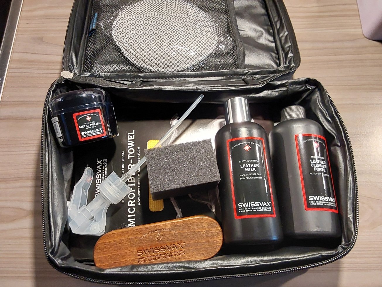 Hier wirkt gerade der Leather Cleaner Forte ein (wird mit einer Bürste aufgetragen und verteilt).