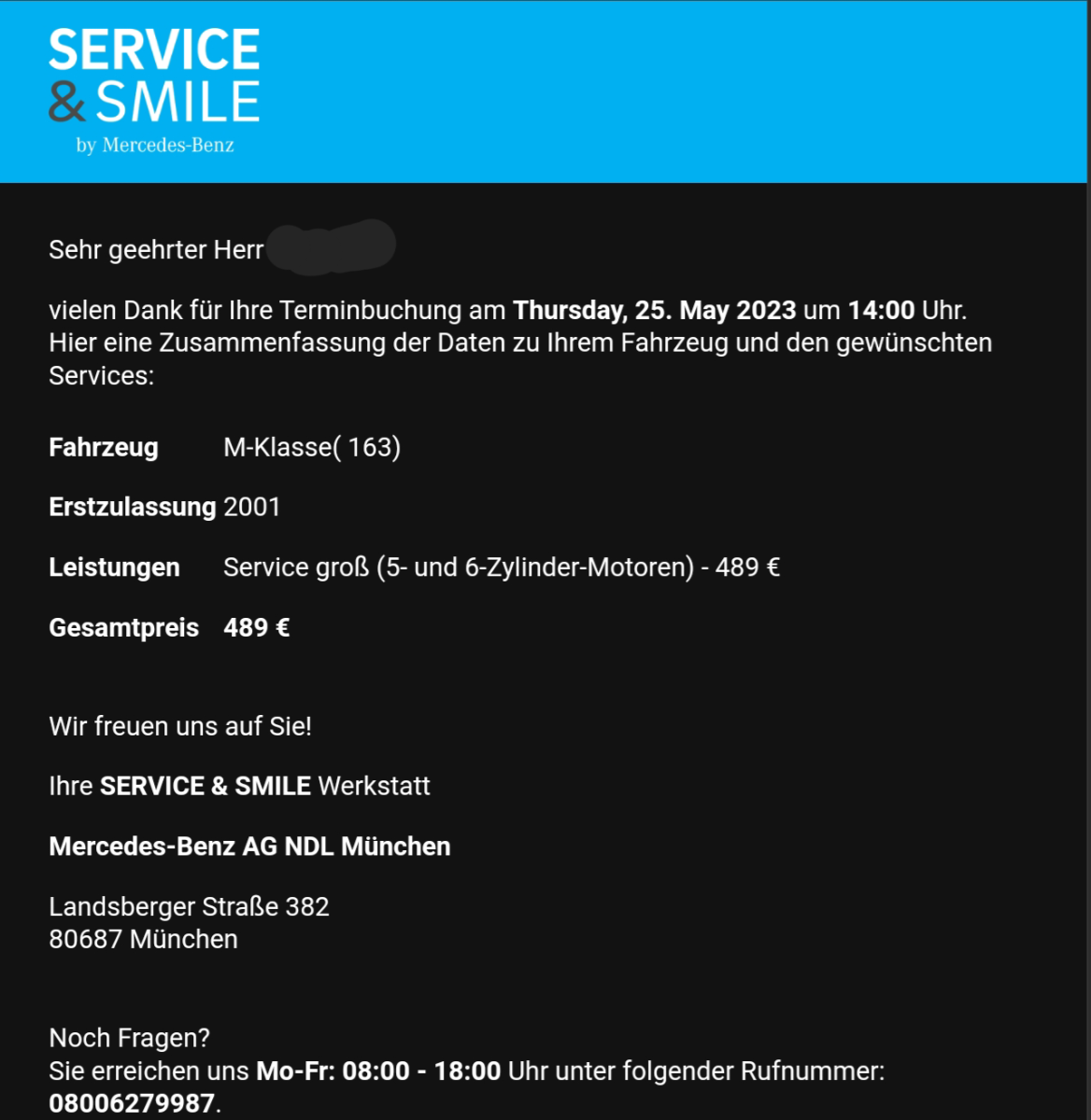 Die Aussagekraft des Ergebnisses ist natürlich nur beschränkt und kapriziert sich logischerweise nur auf diese Werkstatt und kann am Ende des Tages nicht für das "Service & Smile"-Angebot bundesweit sprechen. Falls man hier also alles richtig (oder alles falsch...) macht, muß das anderswo bei gleichem Angebot nicht der Fall sein.