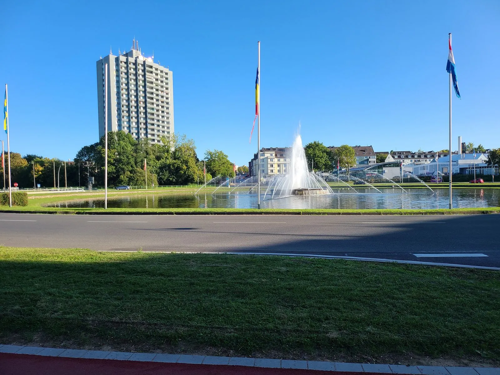 Dann verließen wir die Veranstaltung und umrundeten zu Fuß den Europaplatz, der erst seit 14 Tagen wieder von der Autobahn aus angesteuert werden kann, da auf den zwei letzten Kilometern davor innerhalb von 20 Monaten eine Talbrücke, die Haarbachtalbrücke, komplett erneuert werden musste. Die Zeit hatte man auch dazu genutzt, den Brunnen zu überholen und jetzt wird man bei der Ankunft in Aachen wieder von der vertrauten Fontäne begrüßt, die einem ein "Coming-Home-Gefühl" vermittelt.