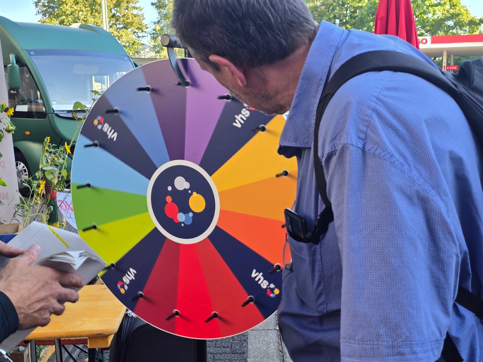 Dort konnten wir Getränke und Speisen zu uns nehmen und Herr Könich stellte sein Glück am dortigen Glücksrad auf die Probe. Dabei gewann er tatsächlich einen blauen Kugelschreiber und kurz darauf, am Stand der Eisenbahn- und Verkehrsgewerkschaft (EVG), konnte er auch noch eine blaue Tragetasche ergattern.