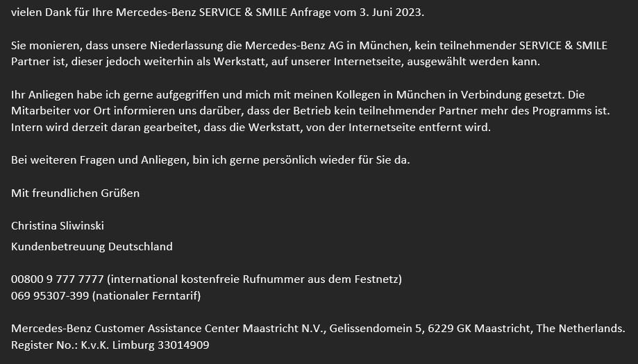 ausdrücklich NICHT bundesweit eingestellt wird - neinnein! Die Mercedes-Benz-Niederlassung München hat nur keinen Bock mehr. An anderen Standorten wird das weiterhin angeboten. Das ist für mich besonders ärgerlich, denn: Der Mechaniker ist wirklich erstklassig gewesen!