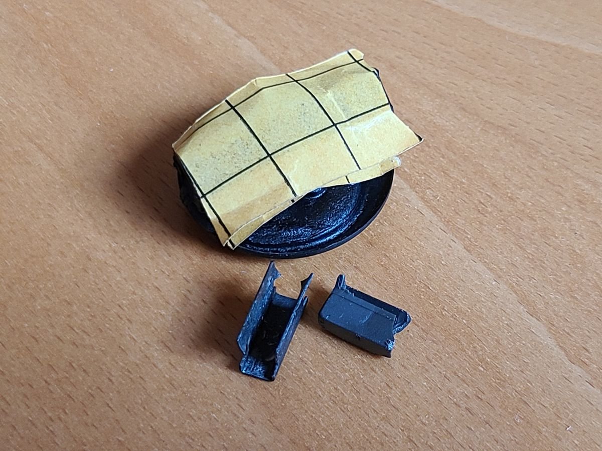 Unter dem Deckel eine der Klammern, mit denen die Windabweiserhebel befestigt werden. Und ein nicht mehr benötigtes Bruchstück der zerbrochenen Hartkunststoffhalterung.