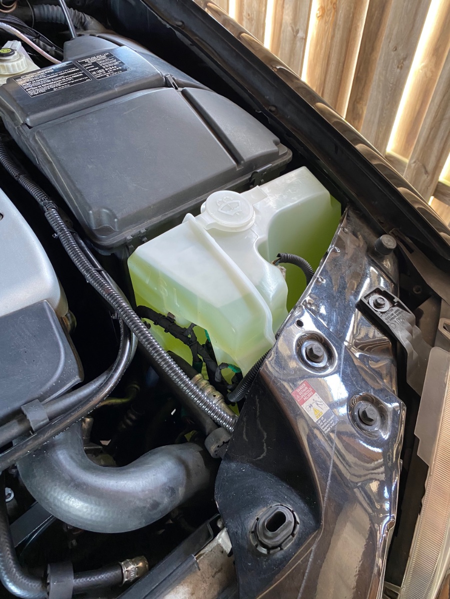 ausgebaut hatte ich den Behälter ohne die Kühlerbrücke zu entfernen. Aber beim Einbau war irgendwie immer die Lasche zum Festschrauben im Weg.