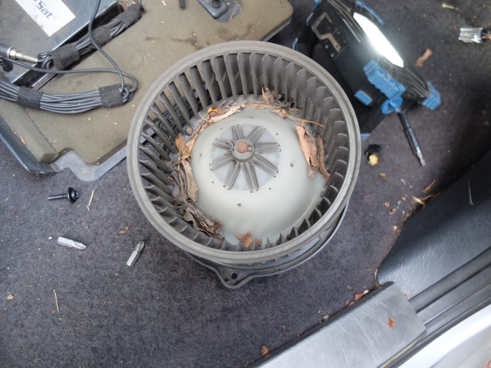 Seit ein paar Wochen ärgerte mich das Gebläse vorne im Armaturenbrett durch zunehmende Geräusche, die jetzt letztendlich so laut wurden, dass ich mich an die Ursachensuche gemacht habe. Zunächst habe ich den Filter erneuert wobei mir ziemlich viel klein zermahlenes Laub entgegenkam. Das aber war nicht die Ursache des Geräuschs, denn an den Lüfter selbst kam ich von dort aus nicht heran. Bisher hatte ich mich noch nicht damit beschäftigt, wie der Lüfter auszubauen sei und vermutete, dass es sehr aufwändig wäre. Aber weit gefehlt! Für Aus- und Einbau benötigt man ca. 15 Minuten.