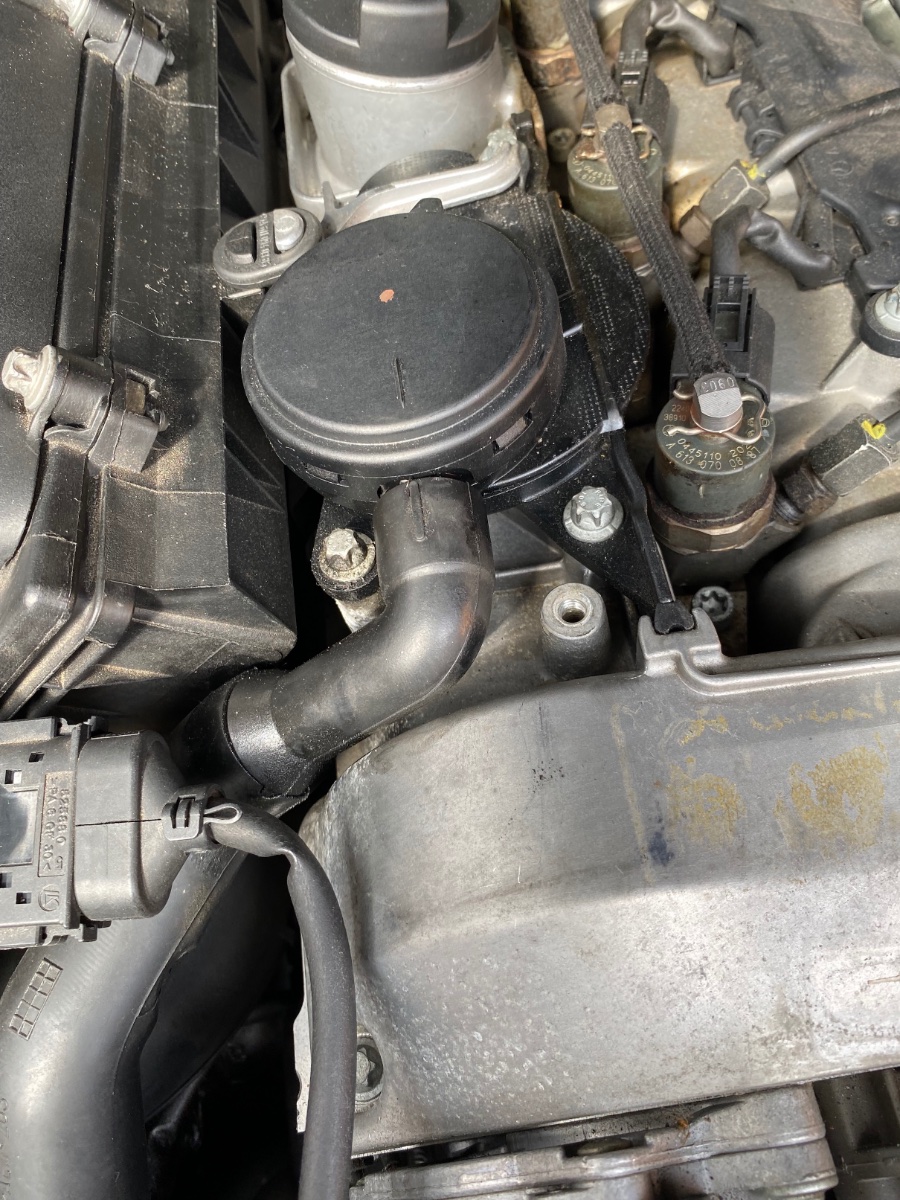 das ist bei meinem 270 CDI auch. Das kommt dort raus, wo der dünne Schlauch von oben in den dicken Luftansaugschlauch mündet. Dazwischen ist noch ein elektrisches Bauteil, ich vermute ein Absperrventil das öffnet und schließt.
