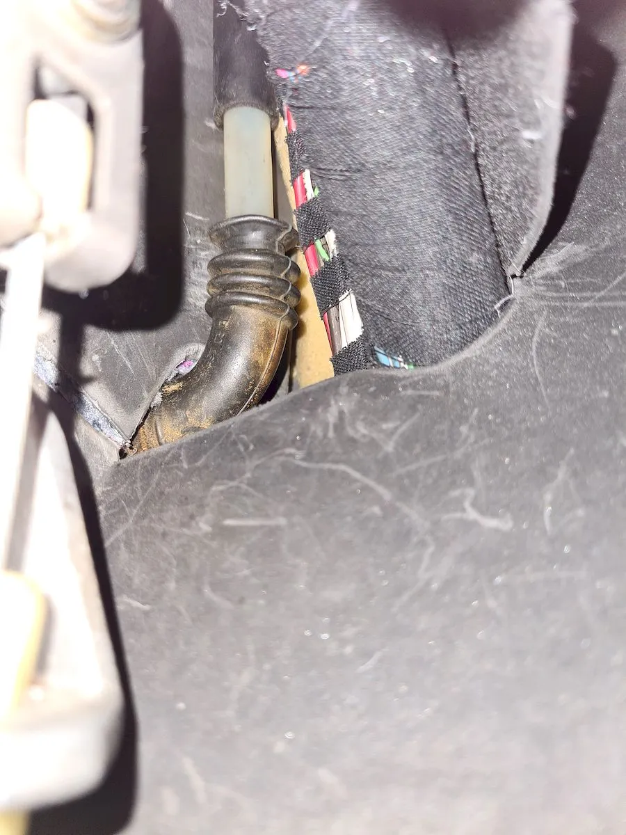 Halt bis in den Fahrerfußraum. Dort hatte sich die vor Jahren, in 2016 war das wohl, eingebaute Verlängerung auf der nach außen führenden Tülle gelöst. Trotz oder, wie ich an den Spuren zu erkennen glaubte, wegen der zusätzlichen Sicherung mit einem "Straps" an dieser Stelle. Wie gesagt, man kommt da extrem schlecht dran. Üble Verrenkungen, sonst geht da gar nichts.