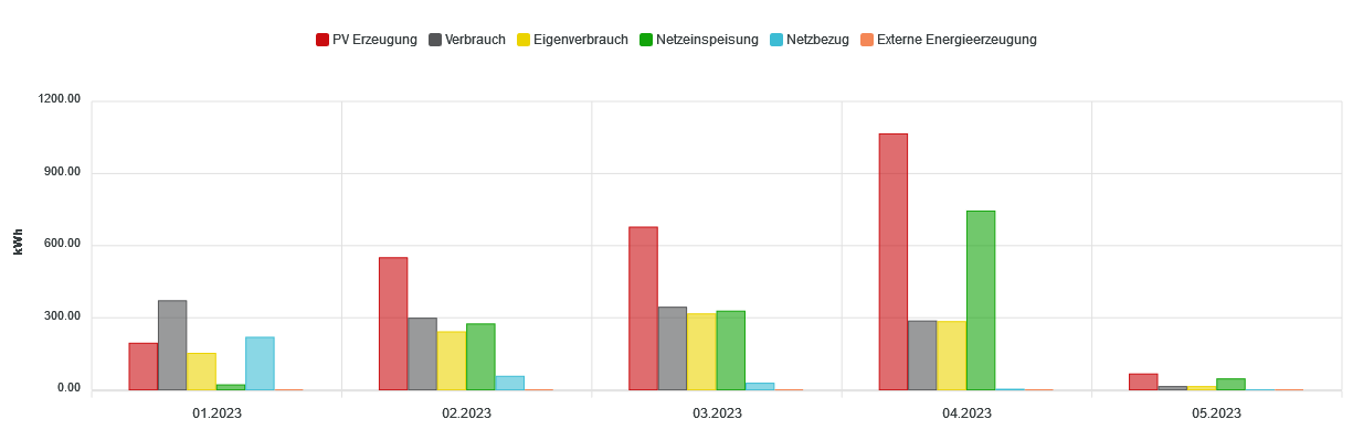 Januar ca. 10 kWh, Februar ca. 20 kWh, März ca. 40 kWh und jetzt im April 70 kWh.