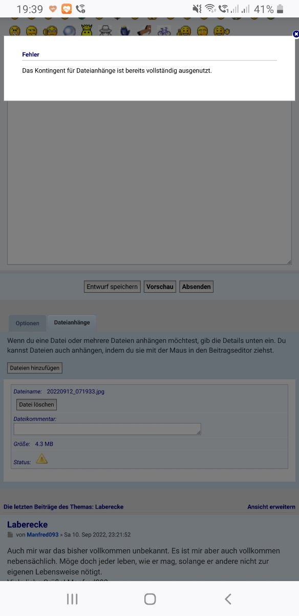 Erst mal meinen herzlichen Dank für den Scrennshot und der Bekanntmachung, denn ich hab davon noch nicht mal was geahnt. Ob das vielleicht ein Grund dafür ist, warum, wie auch heute, ich kaum noch Reaktionen auf Foren-RundMails bekomme?