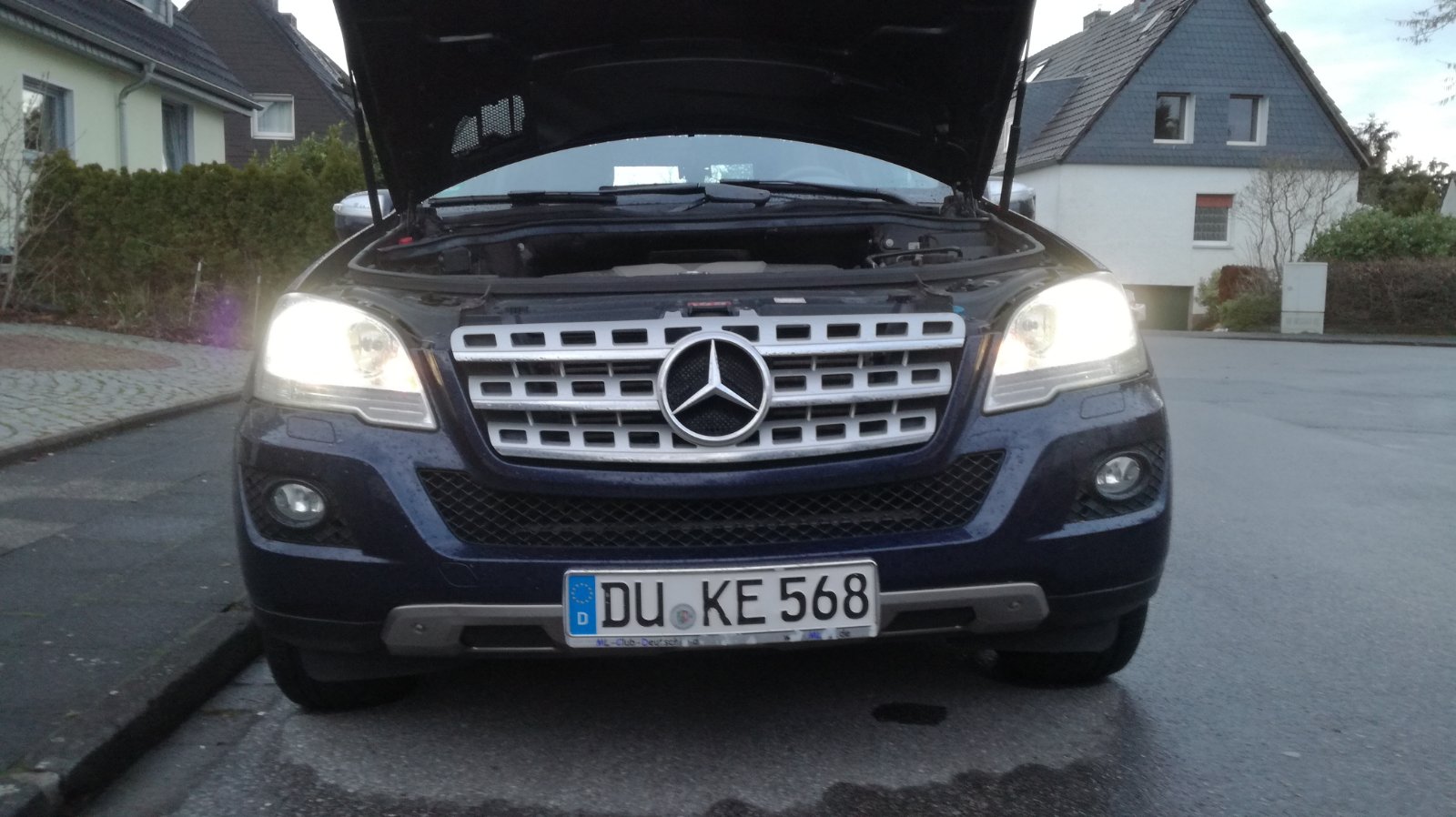Im Rahmen der Beseitigung des Wildschadens an unserem ML habe ich auch den linken Nebelscheinwerfer erneuert. Der alte Nebelscheinwerfer hatte zwei Schlauchanschlüsse für Entlüftungsleitungen und natürlich sind bei mir diese Leitungen auch verbaut und angeschlossen gewesen. Der neue benötigt diese beiden Schläuche nicht mehr. Dort wird die Belüftung im Scheinwerfer selbst hergestellt. Zwischen zwei Schlauchanschlüssen links und rechts direkt hinter der Lichtscheibe und zwei Schlauchanschlüssen direkt neben der Glühlampe, besteht jeweils eine direkte Schlauchverbindung. So kann die heiße Luft, die an der Glühlampe entsteht, direkt die Lichtscheibe erreichen und damit ein Beschlagen verhindern. Die Schläuche habe ich mal liegen lassen. Benötigt werden sie allerdings nicht mehr. Nur, damit sich keiner wundert, wenn er das auch bemerkt.