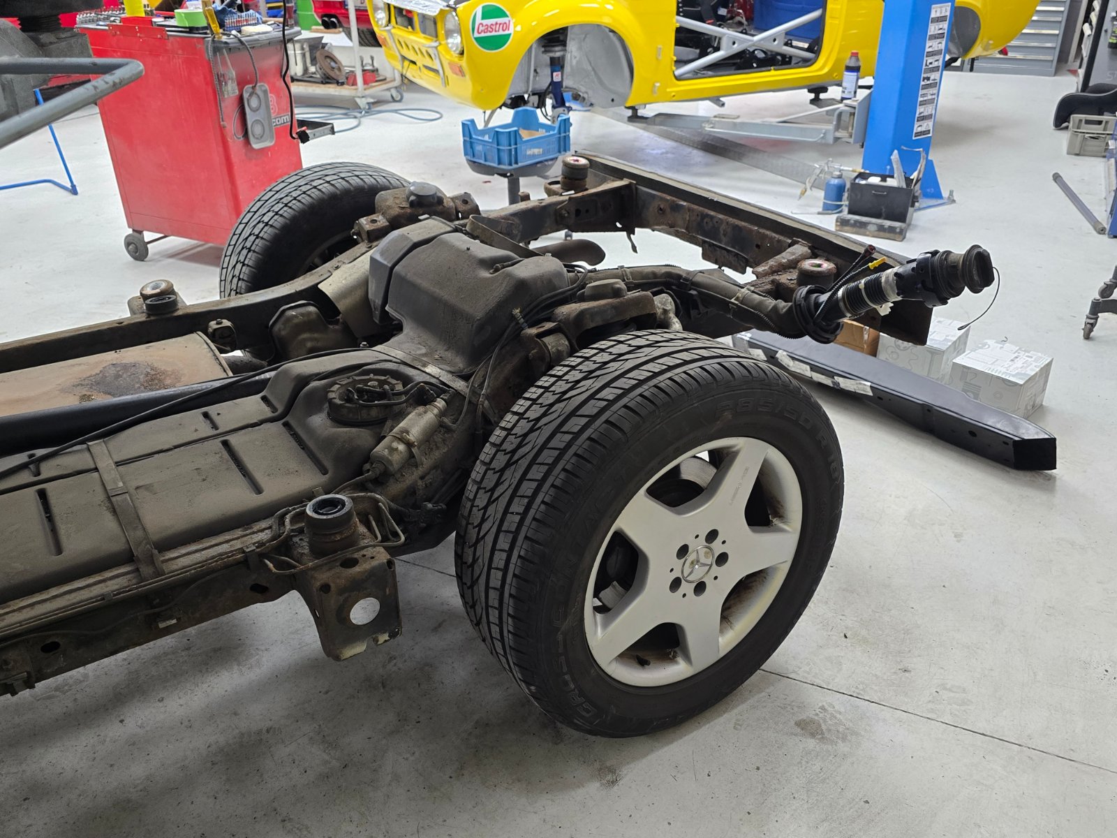 Heute habe ich mal wieder unseren ML besucht. Er macht Fortschritte. Die Vorbereitungen für das Abheben der Karosserie sind fast vollständig abgeschlossen. Geplant ist es, diese morgen vom Rahmen zu trennen. Anbei ein paar neue Fotos dazu.