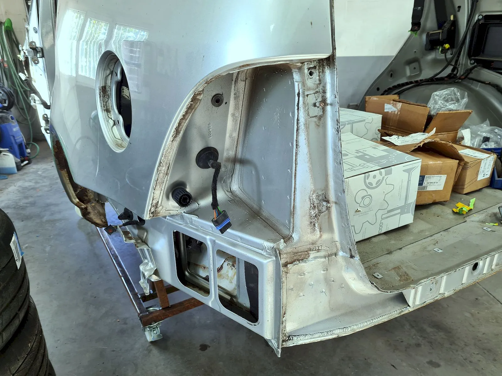 Motor und Getriebe bleiben drin. Da man aber im momentanen Zustand sehr gut an den Motor kommt, werden wohl die Ventilschaftdichtungen erneuert, denn der Motor hat immerhin 510.000km gelaufen. Das wird dann ein Motorinstandsetzer dort vornehmen. Die Fahrwerksteile sind vor nicht allzu langer Zeit erneuert worden. Das geht auch gut, wenn der ML wieder zusammengebaut ist.