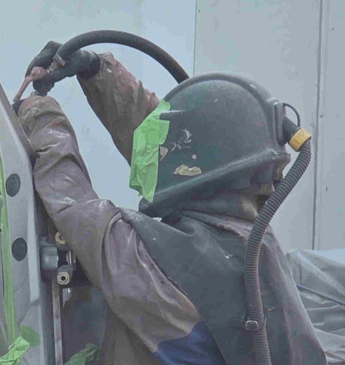 Was aber kaum jemand ahnen wird, ist, wer unter dieser Schutzausrüstung steckte: Nämlich die freundliche Tochter von Dieter Kurabi, etwa Mitte 20, die neben ihrem eigentlichem Beruf, im Betrieb ihres Vaters immer mal wieder bei solchen Gelegenheiten aushilft, die ich beim Wechsel der Glasscheibe ihres Visiers kennengelernt habe, denn auch diese muss immer wieder ausgetauscht werden, da der Strahlsand diese auf Dauer undurchsichtig macht.