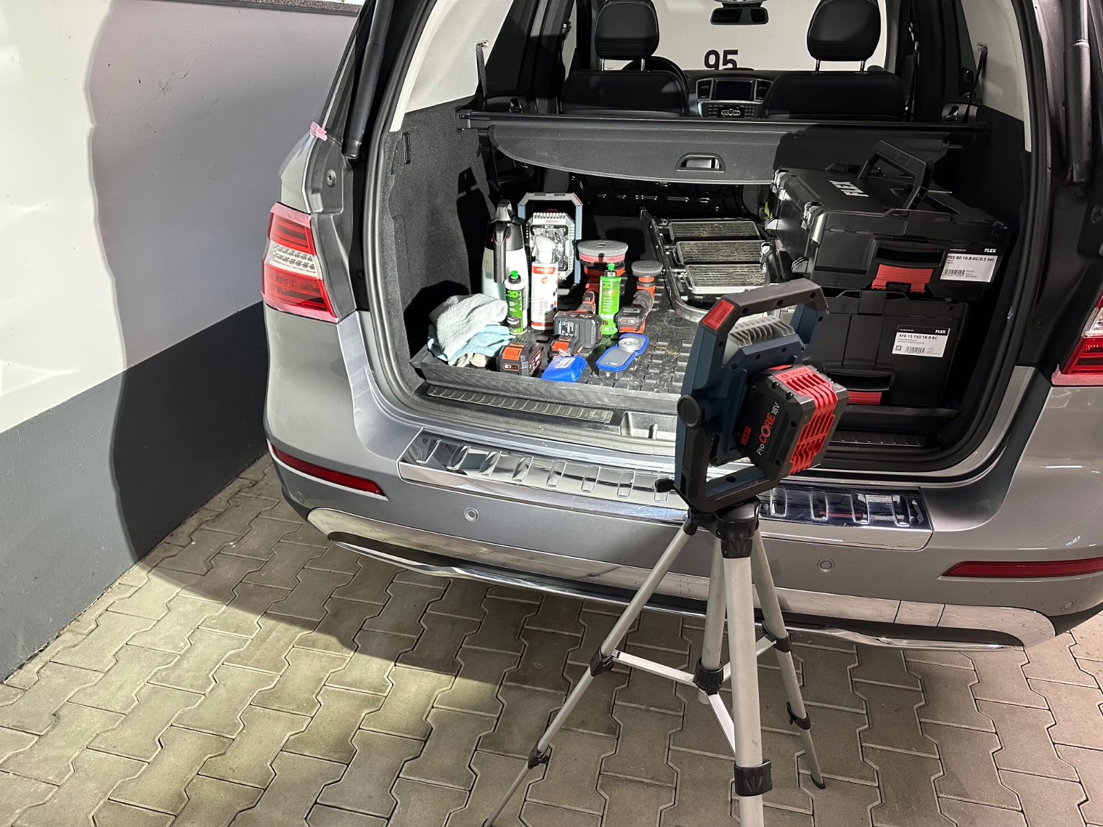 In der Tiefgarage waschen und anschließend polieren. Zuerst hab ich es mit einer Feinpolitur probiert, doch der Klarlack ist so hart das härtere Mittel angesagt waren. Die Motorhaube mit einem mittleren Pad und der 520 Politur, den Rest dann mit der gleichen Politur und einem feinen Pad, ein Finisch-Pad. Alle feinen Waschstraßen-Kratzer beseitigt und ein Hologramm freies Ergebnis: